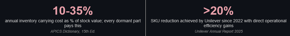 In most manufacturers, adding a new part requires an engineering sign-off. Removing one is a political event. Capital expenditure needs approval. Headcount needs approval. A new part number which carries years of sourcing, inventory, and production cost often needs neither. That asymmetry is where the problem lives.