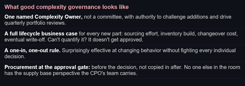 The manufacturers winning on cost aren't doing it through harder negotiation alone. They have made themselves simpler to operate. Fewer parts, deeper supplier relationships, leaner runs. Complexity reduction is a procurement strategy. It just doesn't always get called that.